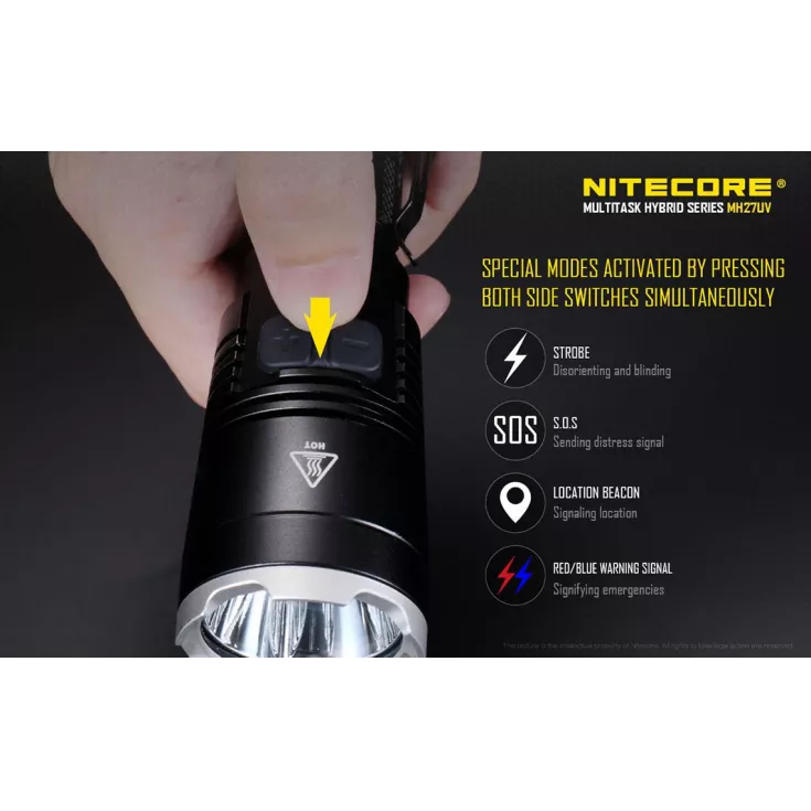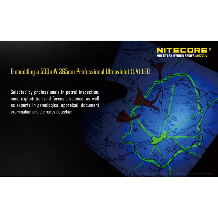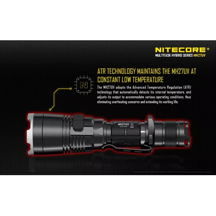 The updated version of the popular MH27 features four brightness levels ranging from 1 to 1000 lumens, in addition to a red and blue LED which are ideal for tactical applications. The most noteable aspect of the flashlight is the 500mW, 365nm ultraviolet LED which is an ideal feature for professionals in petrol inspection, mine exploitation and forensic science, as well as experts in gemological appraisal, document examination and currency detection.