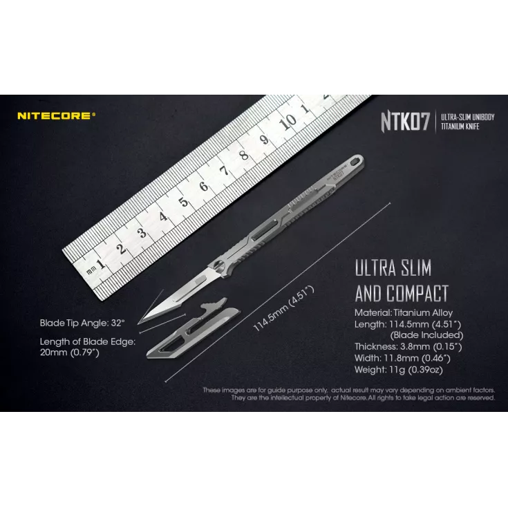 The Nitecore NTK07 is an ultra-slim scalpel knife made from aero grade TC4 Titanium Alloy, known as one of the modern metals due to its high strength, low density and strong corrosion resistance. CNC machined to strict precision of 0.001mm. A sandblasted finish helps avoid noticeable scratches.