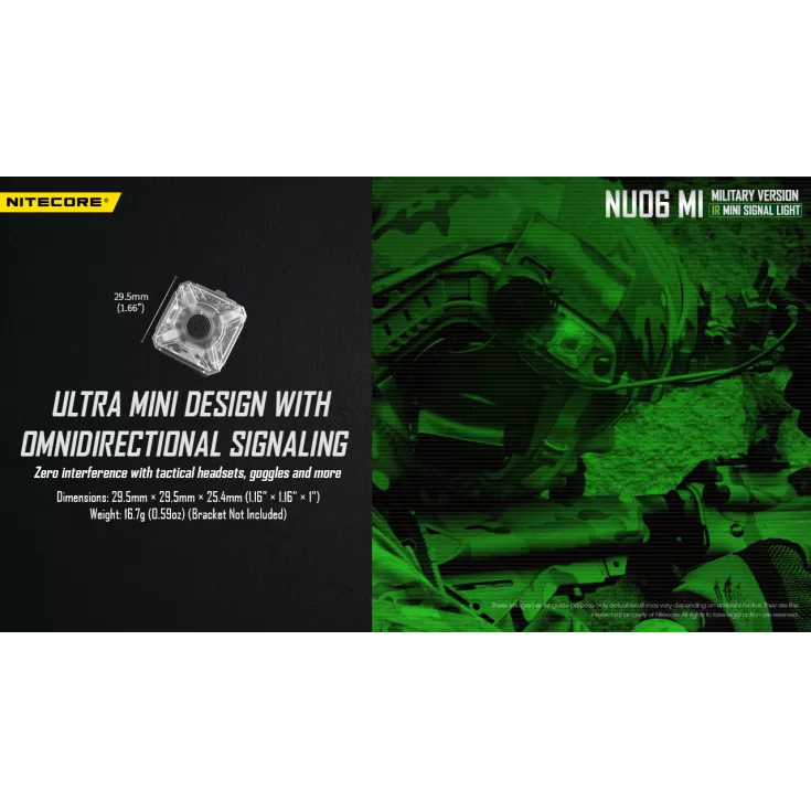 The Nitecore NU06 Mi is a mini signal light with four light sources and nine modes of operation including constant-on modes and flashing modes of IR (940nm wavelength), blue, green and red, as well as a red/blue warning flash. The flashing colours help enable the identification of team members.