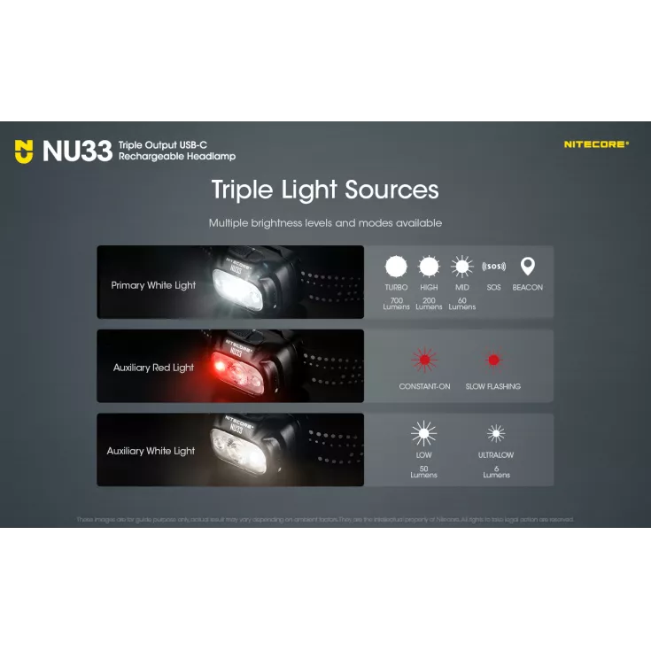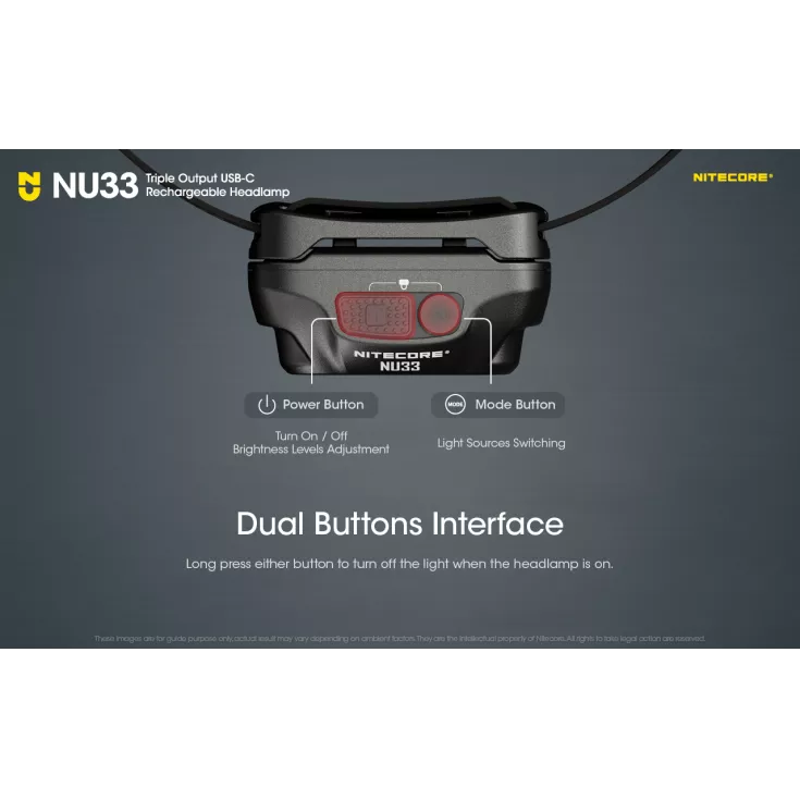 The NU33 features a primary white light, plus an auxiliary red light and an auxilary white light. The auxilary red is useful when stargazing, wildlife observations, night photography and emergency response. All outputs can be accessed with the user-friendly dual button interface. A battery power indicator can also be accessed with a short press of the mode button.