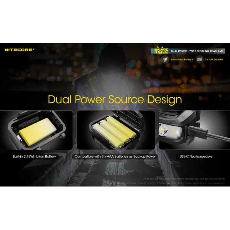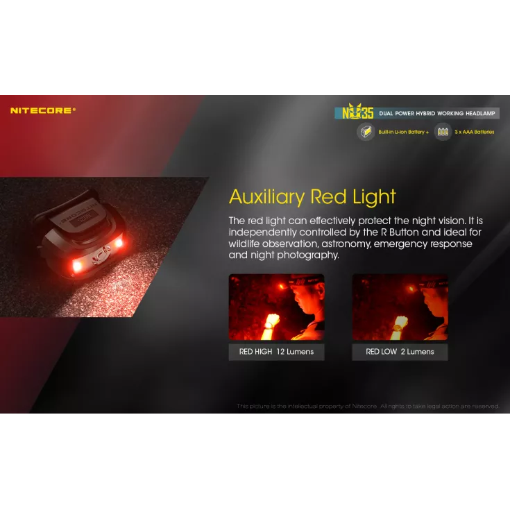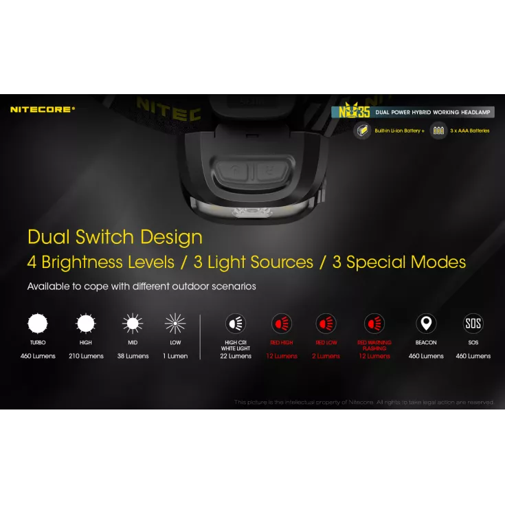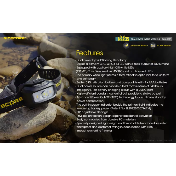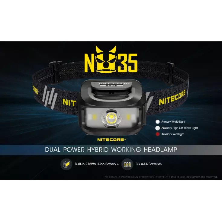 Other unique features of the Nitecore NU35 include: Advanced power cut-off (APC) technology provides an ultra-low standby current. Physical protection against accidental operation. Highly efficient constant current circuit (non-PWM) for a comfortable viewing experience and power indicator beside the main light to show remaining battery power.