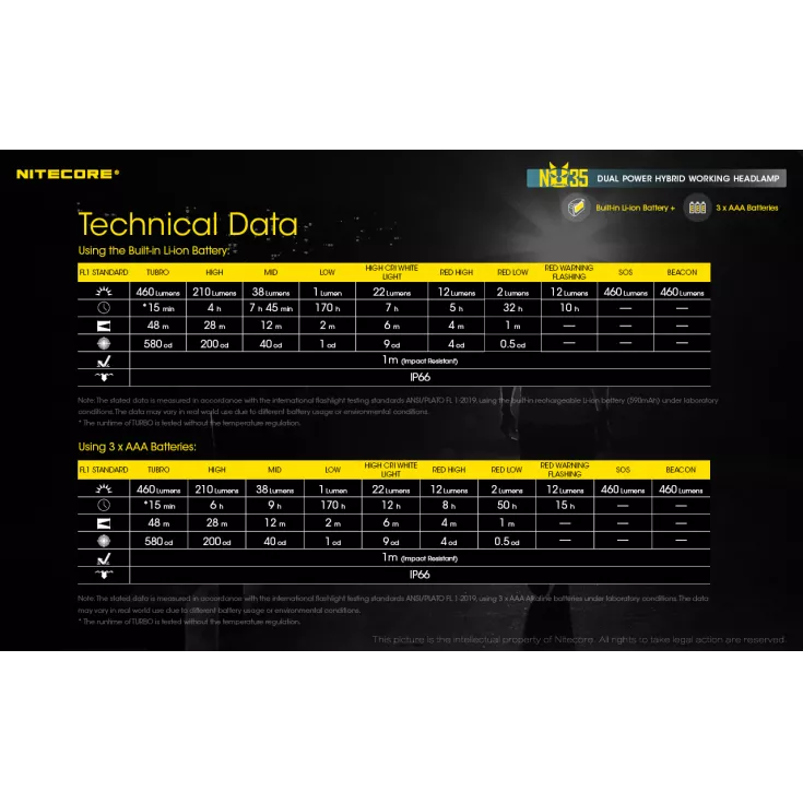 The Nitecore NU35 Head Torch provides unique hybrid power from a built-in rechargeable L-ion battery, and also compatible with 3 x AAA batteries as a backup power source. In combination they provide an extended runtime of up to 10 hours on high output level (210 lumens). Rechargeable via USB-C.