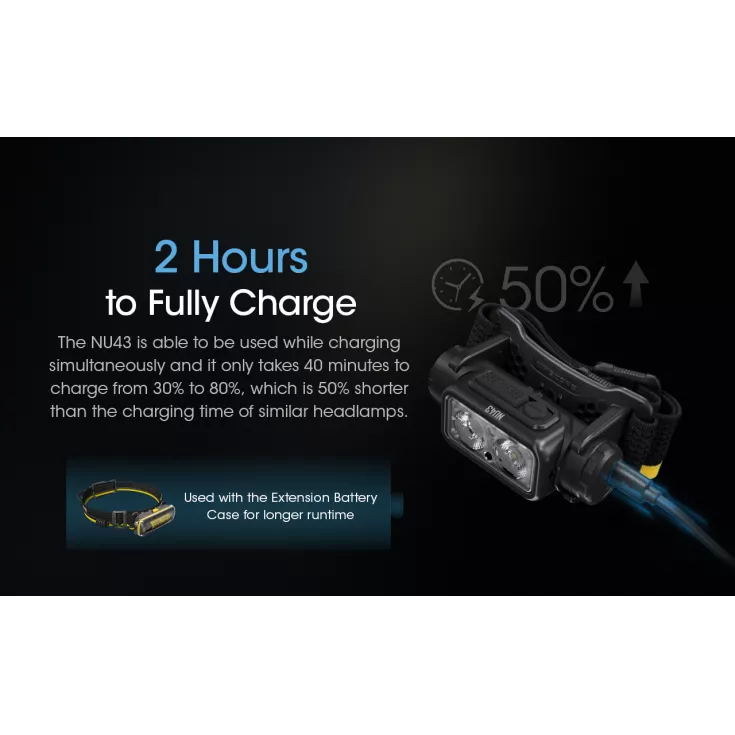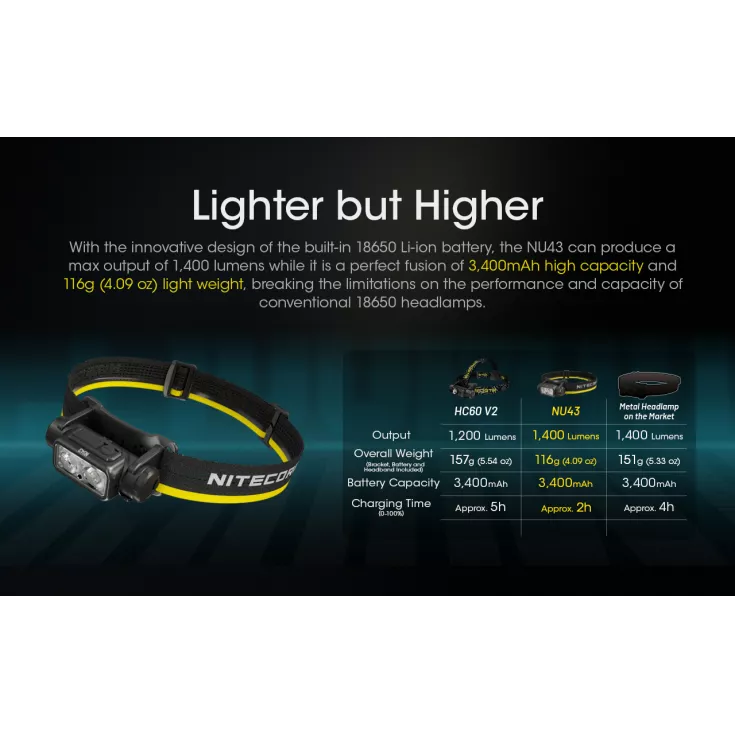 The Nitecore NU43 is the worlds lightest 18650 rechargeable headtorch, weighing just 116g (4.09oz). The torch offers a maximum output of 1400 lumens and a beam range of up to 130 meters.