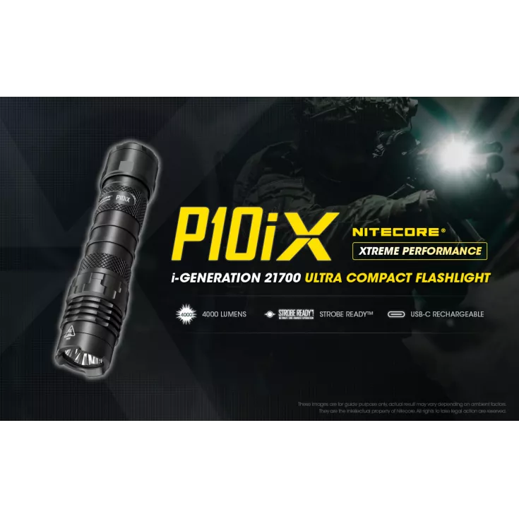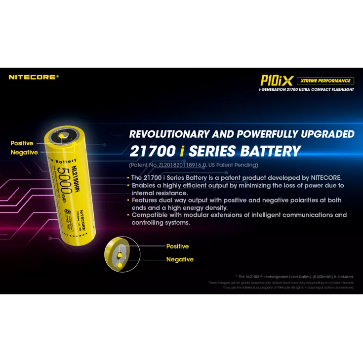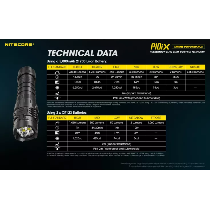 Nitecore P10iX includes: Nitecore NL2150HPi 5000mAh li-ion 21700 battery, NTH10 tactical holster, pocket clip, wrist lanyard, spare o-ring, CR123 battery magazine and USB-C charging cable.