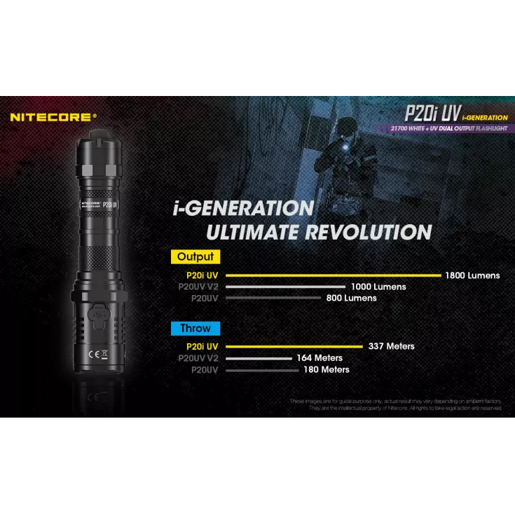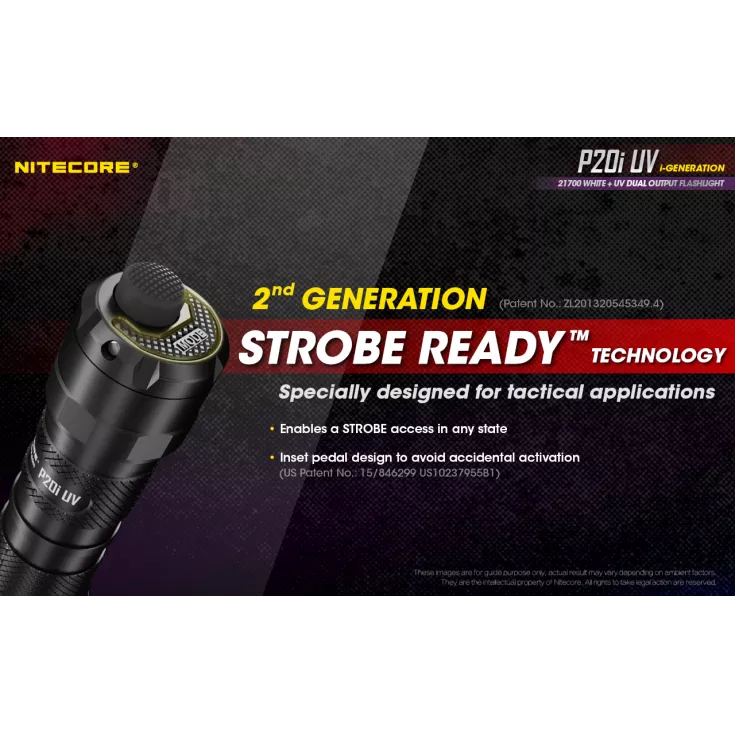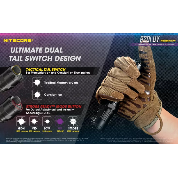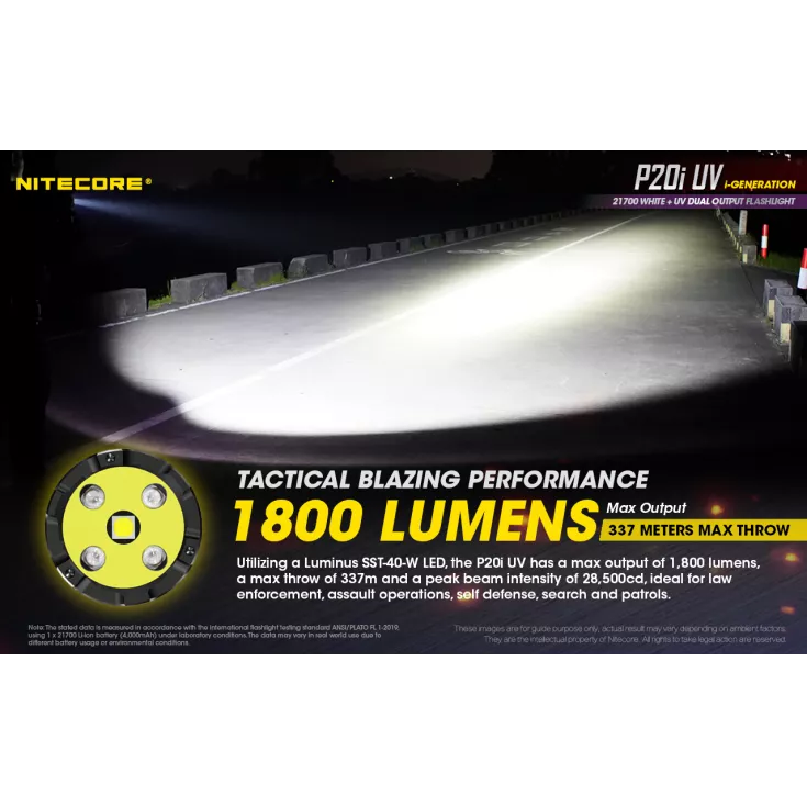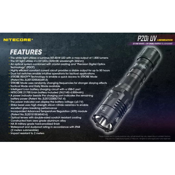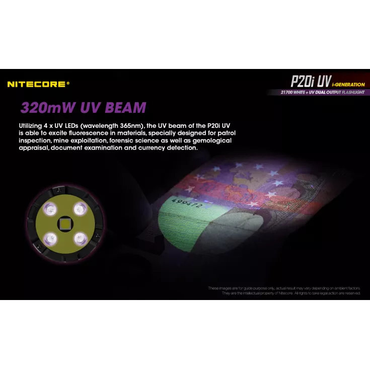The Nitecore P20i UV is a rechargeable high power torch with both white light and Ultra Violet outputs. Featuring a Luminus SST-40-W LED with a maximum output of 1800 lumens in addition to four UV LEDs with a wavelength of 365nm. The UV beam of the P20iUV has many applications including document examination, currency validation and forensic science.