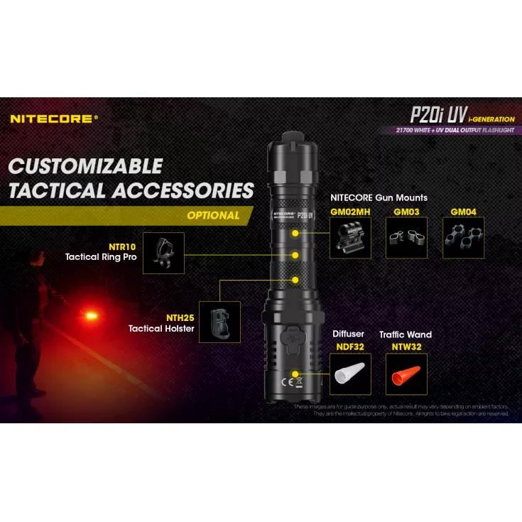 Compatible with a wide range of Nitecore accessories including 32mm filters and diffusers, gun mounts, HMR2 helmet mount and TSL10i tail cap. All available separately.