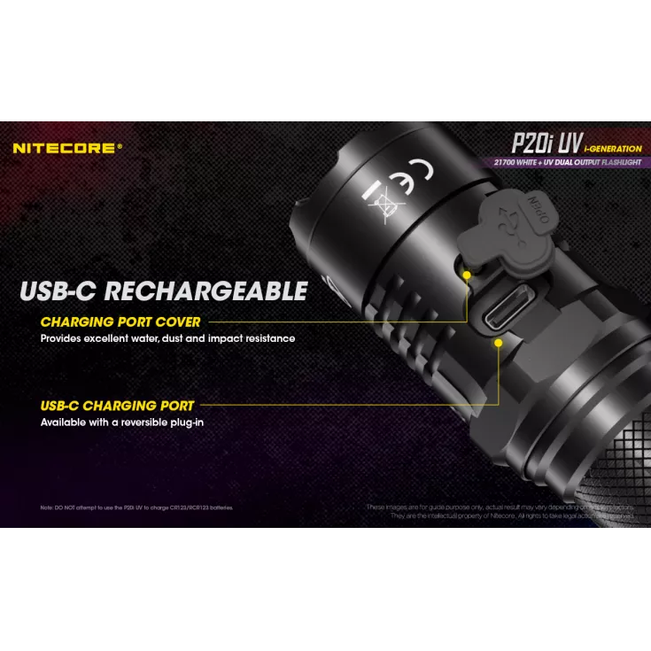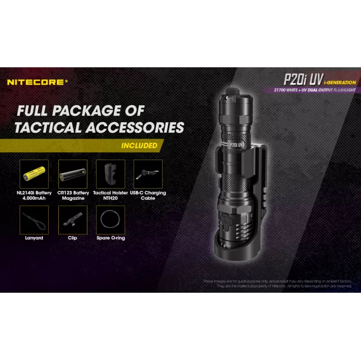 Nitecore P20i UV Includes: NL2140i 4000mAh battery, CR123 battery magazine, NTH20 tactical holster, USB-C charging cable, wrist lanyard and removable pocket clip.