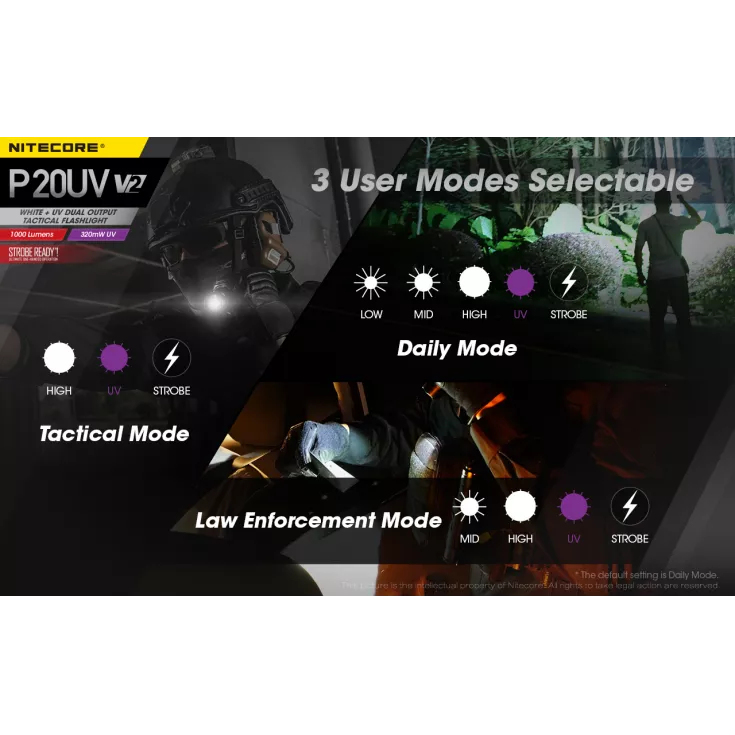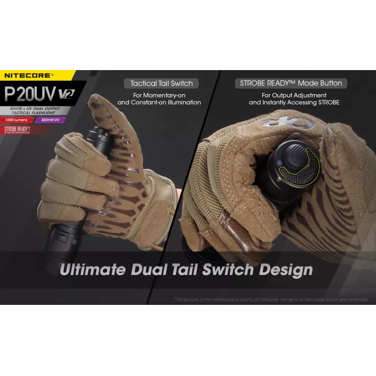 The Nitecore P20UV V2 retains the popular features of the original with an increase of brightness from the white LED output to 1000 lumens and 320mW UV (wavelength 365nm). Powered by a single 18650 Li-ion battery or two CR123A primary cells.