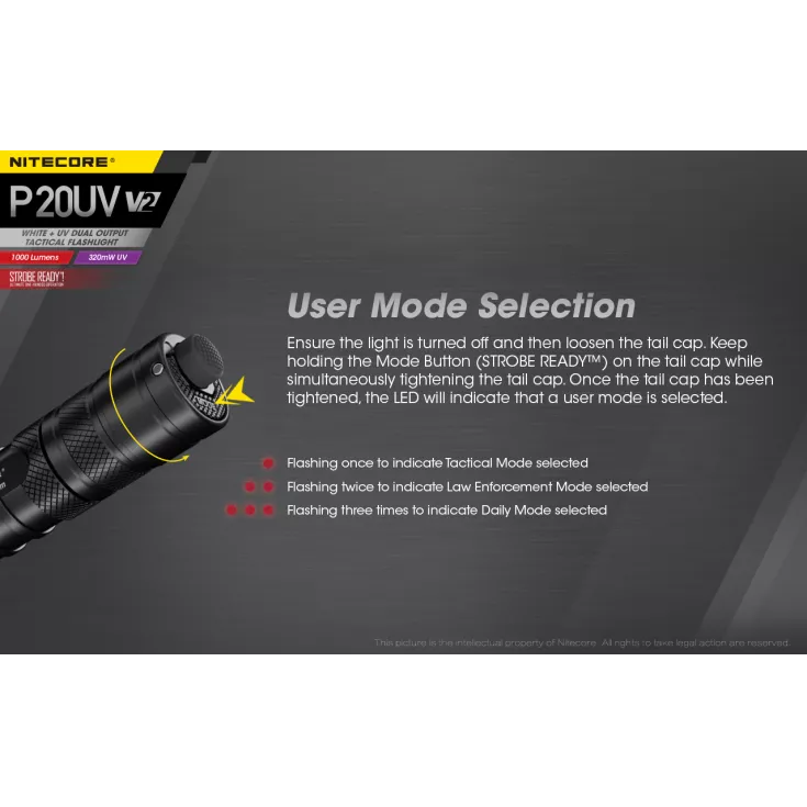 The tail cap of the P20UV V2 has been completely redesigned yet still retains separate power and mode switches, which allows for instant access to strobe from any state. The on/off switch has momentary-on functionality with a half press. A red power indicator next to the switches displays the remaining battery power. Three user modes are available to set the torch into the most suitable state: