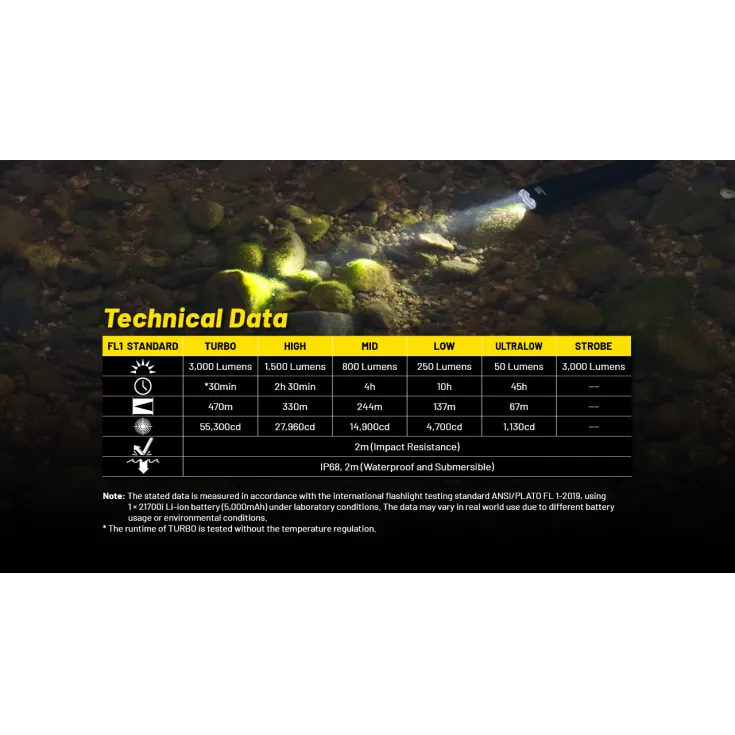Turbo: 3000 lumens – 30 minutes – 470 meters
