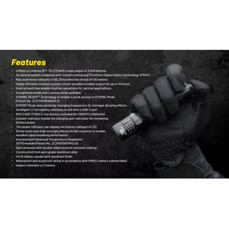 The Nitecore P23i tactical flashlight features an all new Luminus SFT-70 LED for improved brightness and long range lighting. The torch boasts an impressive output of 3000 lumens and a maximum beam distance of 470 meters.