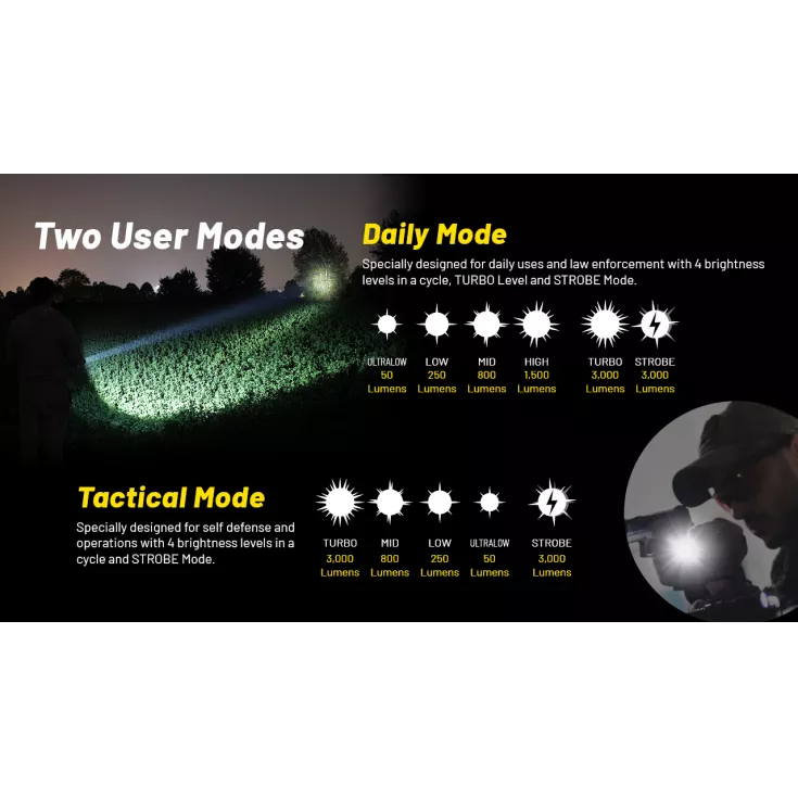 Daily Mode: Features four brightness levels in a cycle, Turbo and Strobe Mode.