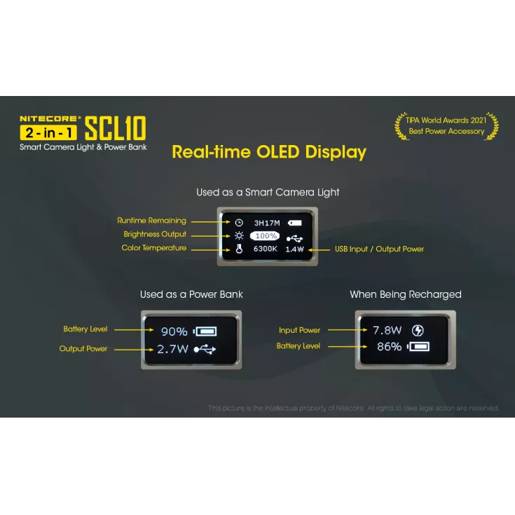 An OLED display shows the status in each state, whether being used as camera light, power bank or while being recharged,