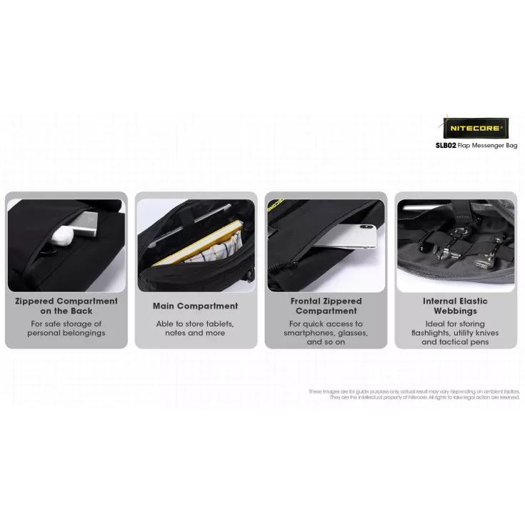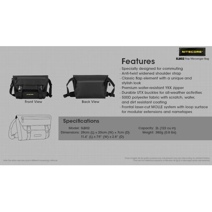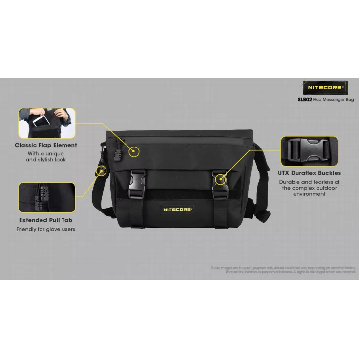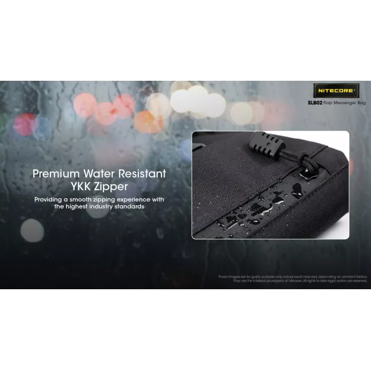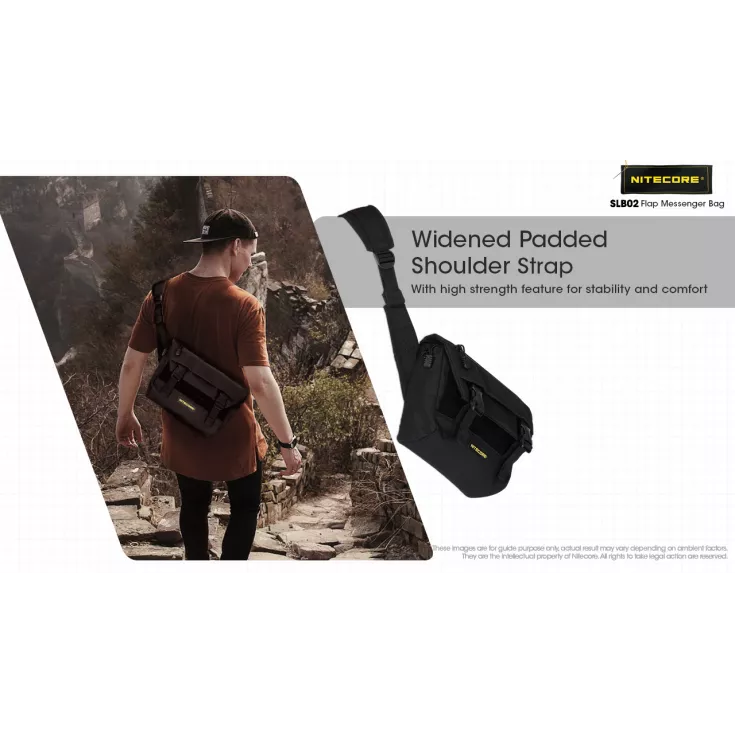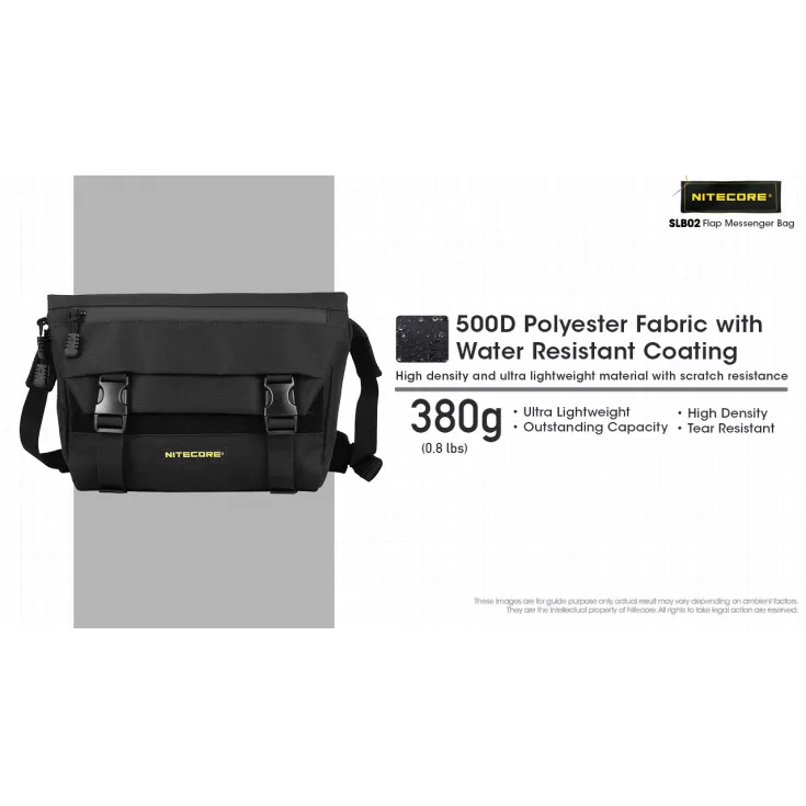 The Nitecore SLB02 flap messenger bag is specially designed for commuting. This ultra light bag is made from 500D polyester; a scratch resistant, tear resistant fabric with a water and dirt resistant coating.