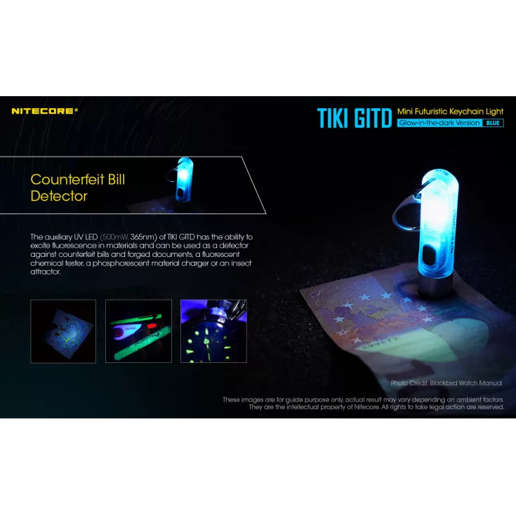 As with the other TIKI lights, the GITD Blue version features two auxiliary LEDs; a high CRI white LED and a 365nm 500mW UV LED. These additional light sources make the keychain torch suitable for a broader range of applications, such as reading, camping and checking for counterfeit currency notes and documents.