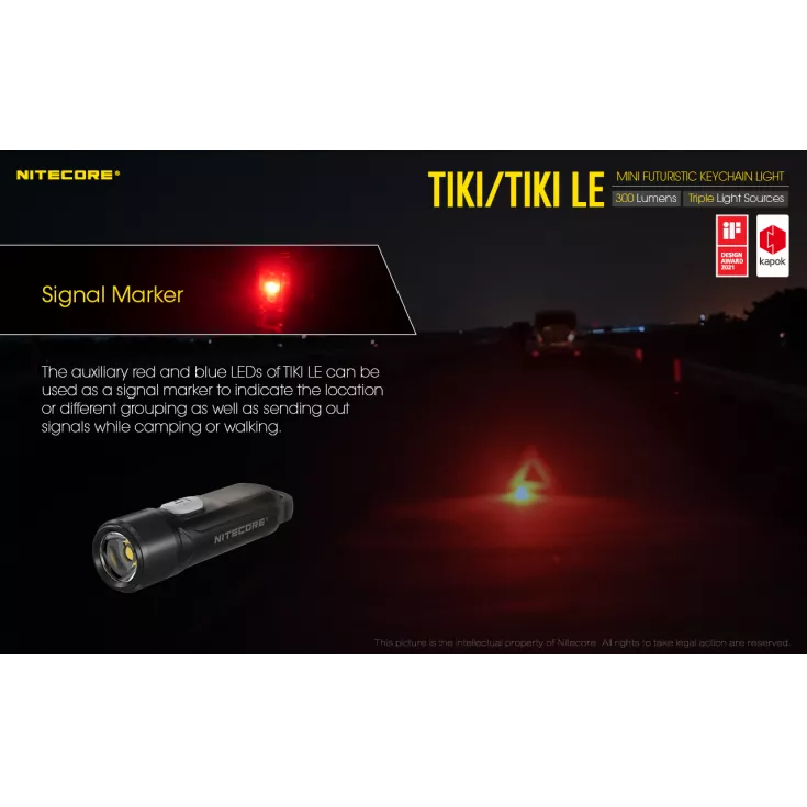 The auxiliary red and blue LEDs of the TIKI LE can be used as a signal marker to indicate location and also set to flashing alternating blue / red, which can be used as a warning light making it ideal to draw the attention of oncoming vehicles and pedestrians to avoid potential hazards.