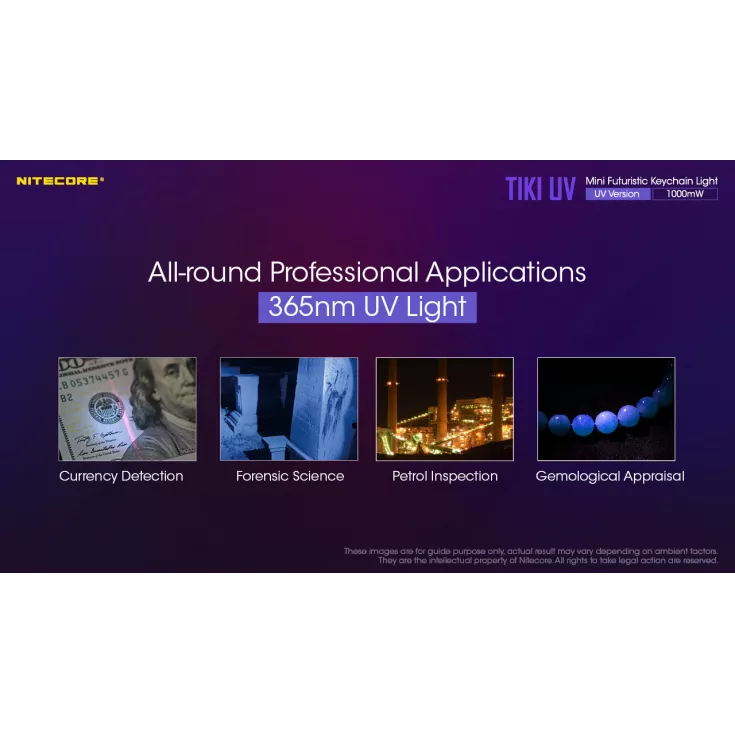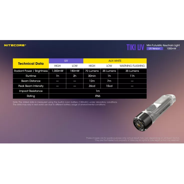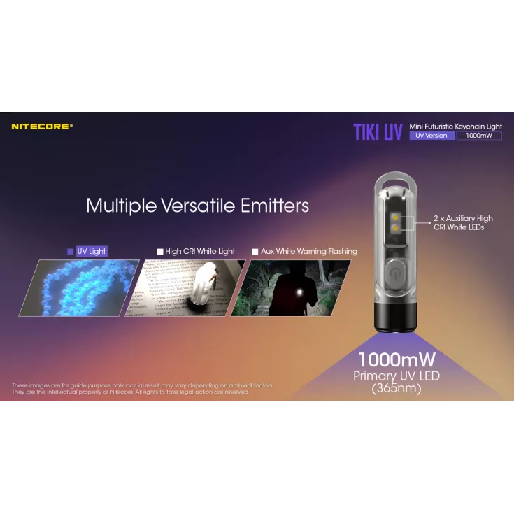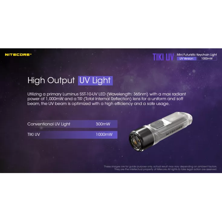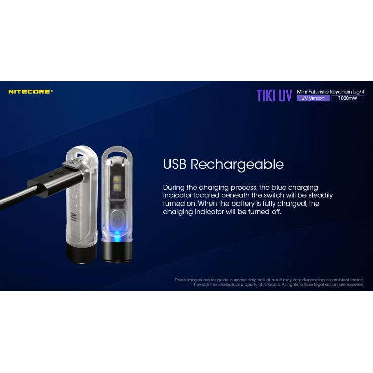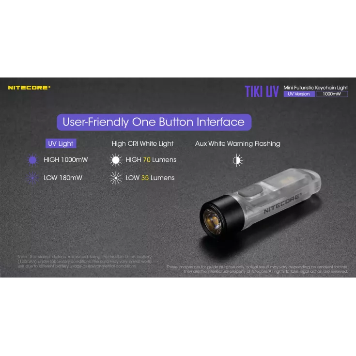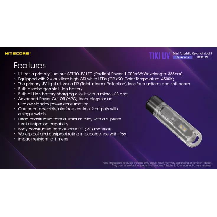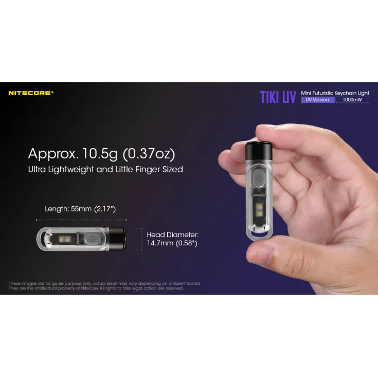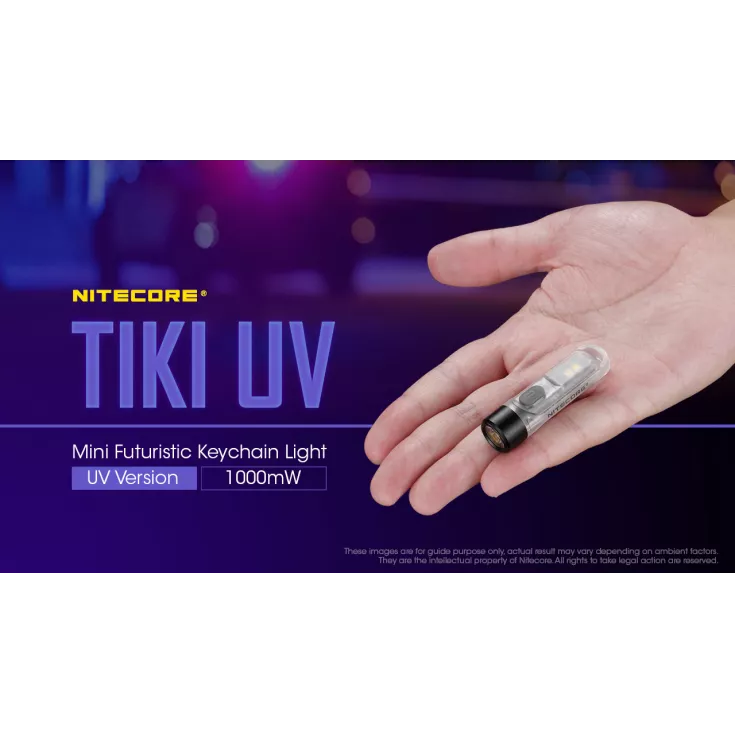 The Nitecore TIKI UV is a new rechargeable key ring torch that is extremely light weight (10.5 grams) and compact (5.5cm) yet has a maximum output of 1000mW 365nm of ultraviolet light from the Luminus SST-10-UV LED. A built-in 130mAh Li-ion battery is housed inside the TIKI UV and has comparable efficiency to a AAA cell at a fraction of the weight.