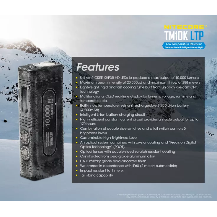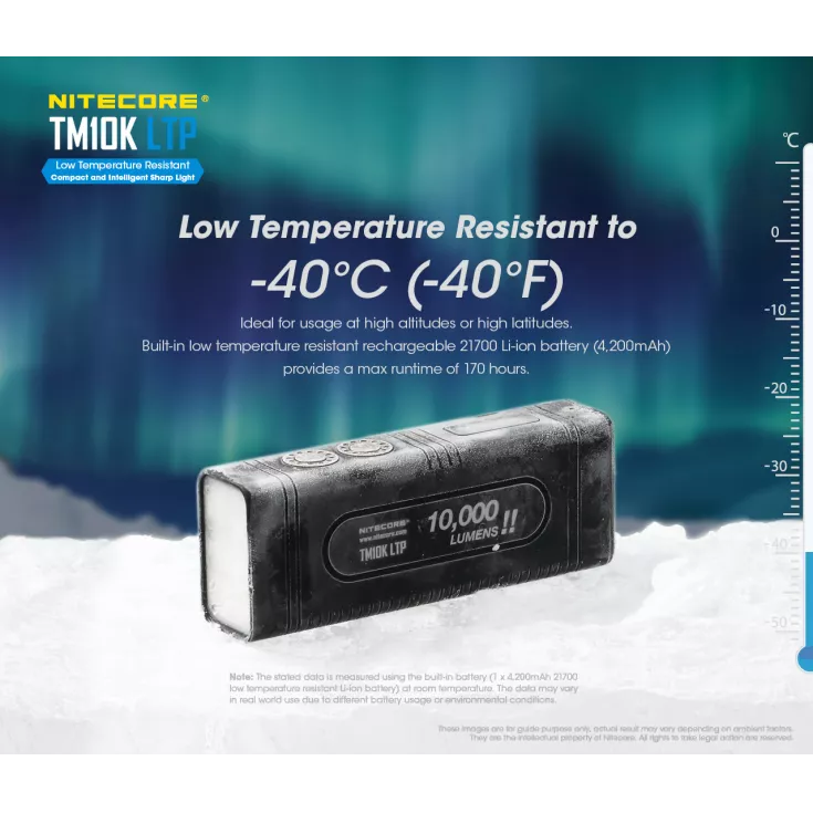 The flashlight is compact, light and specifically designed for temperatures as low as -40°C. It is ideal for usage at high altitudes and high latitudes. It has a built-in low temperature resistance rechargeable 2100 Li-ion battery that provides a maximum runtime of 170 hours.