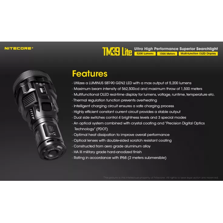 The Nitecore TM39 Lite has the same head as the TM39 but a shorter body, housing 4 x 18650 li-ion batteries rather than the NBP68HD battery pack the standard model comes with. The flashlight has the same fantastic maximum output of 5200 lumens from the Luminus SBT-90 Gen 2 LED and a maximum beam distance of 1500 meters.
