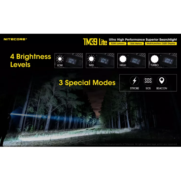 The Nitecore TM39 Lite features four brightness levels, ranging from 200 to 2500 lumens, and three special modes for emergency use. The flashlight is operated using a dual switch interface for fast and easy access to the modes, including direct access to the Turbo and Low outputs.