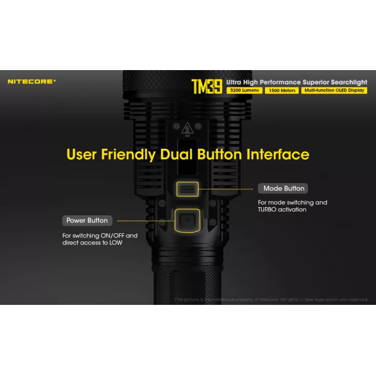 The TM39 features a dual button user interface which operates the four brightness levels, ranging from 200 to 5200 lumens, and the three special modes, SOS, strobe and beacon. The flashlight has an OLED display screen showing useful information such as battery voltage, remaining runtime and the torch’s temperature. In addition, the Nitecore light has a memory function to remember the last used brightness level and lockout mode to avoid accidental activation.