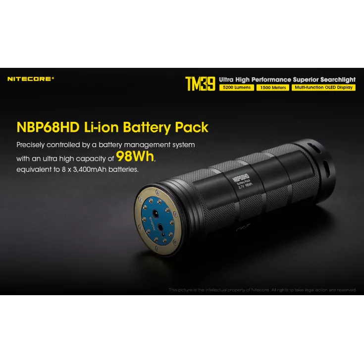 The Nitecore TM39 flashlight is the latest addition to the Tiny Monster series has a Luminus SBT-90 Gen 2 LED with a maximum output of 5200 lumens. The torch is powered by the Nitecore NBP68HD battery pack which is rechargeable, using the included charging cable. The pack can also be charged independently using either the included adapter or Nitecore’s rapid adapter for faster charging (available separately).