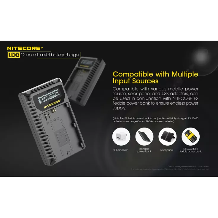 The Nitecore UCN3 camera charger is a portable, dual slot USB charger, compatible with the Canon LP-E6N camera battery. With a maximum output of 1000mA when using a single slot, the charger is perfect for fast, efficient charging for on the go professional and amateur photographers.Â