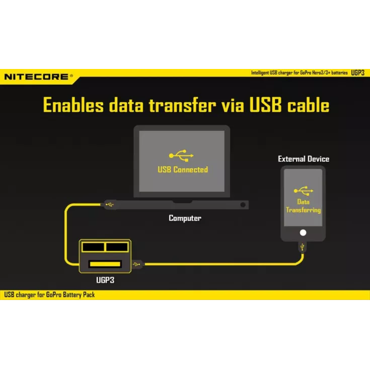 Charger enables data transfer via USB cable.