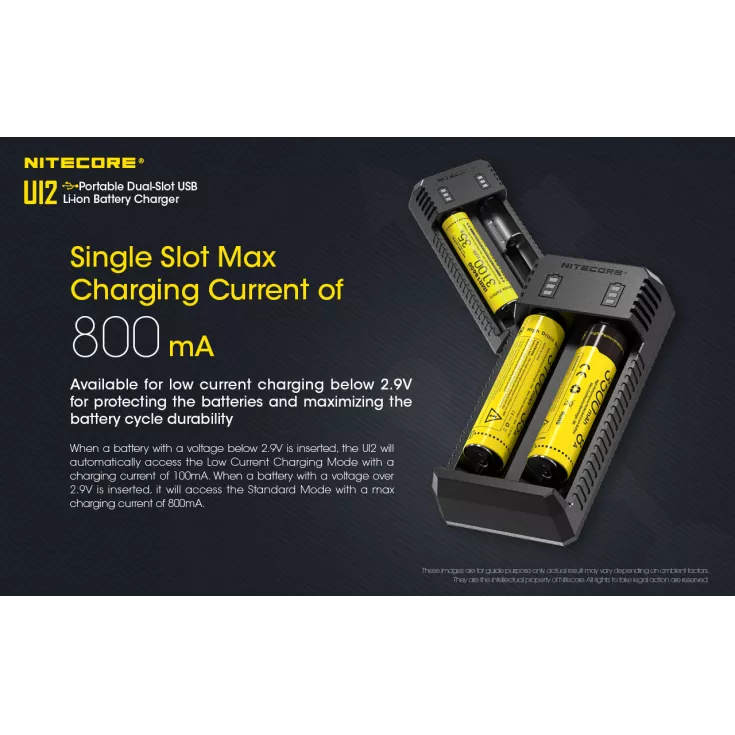The UI2 automatically determines the optimal charging current when a battery is inserted; if below 2.9V the low current charging mode of 100mA will be activated or if over 2.9V the standard mode with a maximum charging current of 800mA is adopted.Â