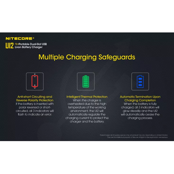 The Nitecore UI2 has a simple display which indicates the charging status of each slot using three LEDs. The charger provides anti-short circuiting and reverse polarity protection, intelligent thermal protection and automatic termination upon charging completion, to keep your batteries in the best of health.