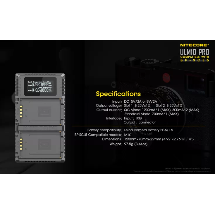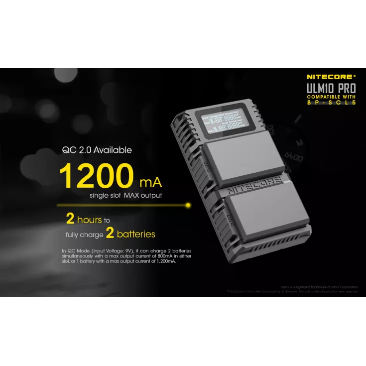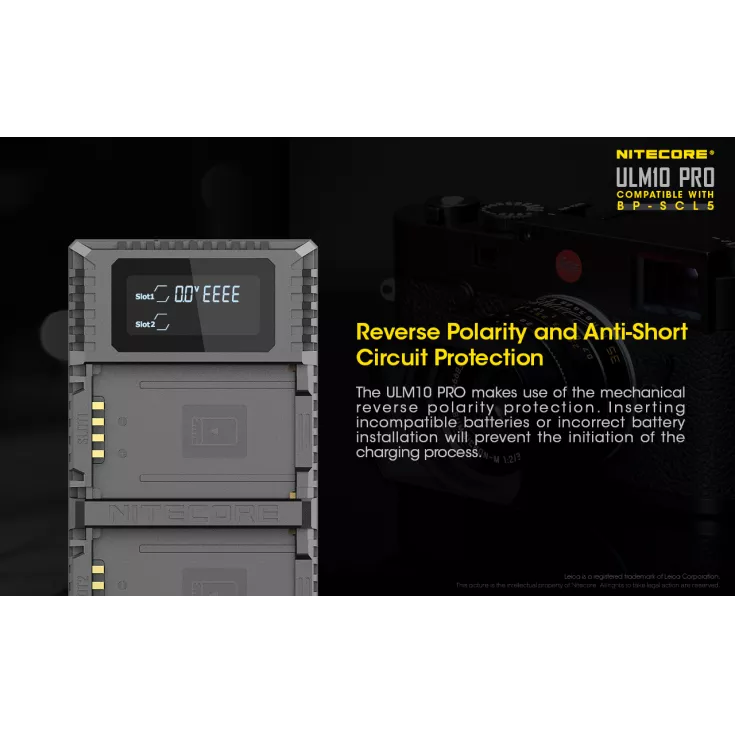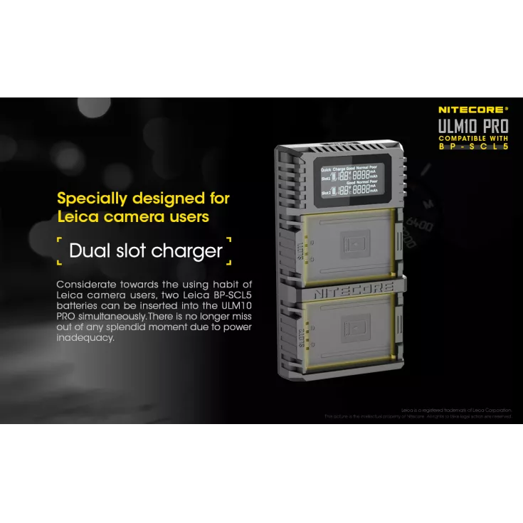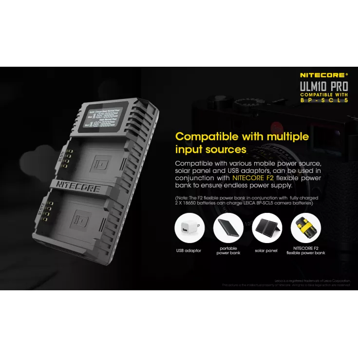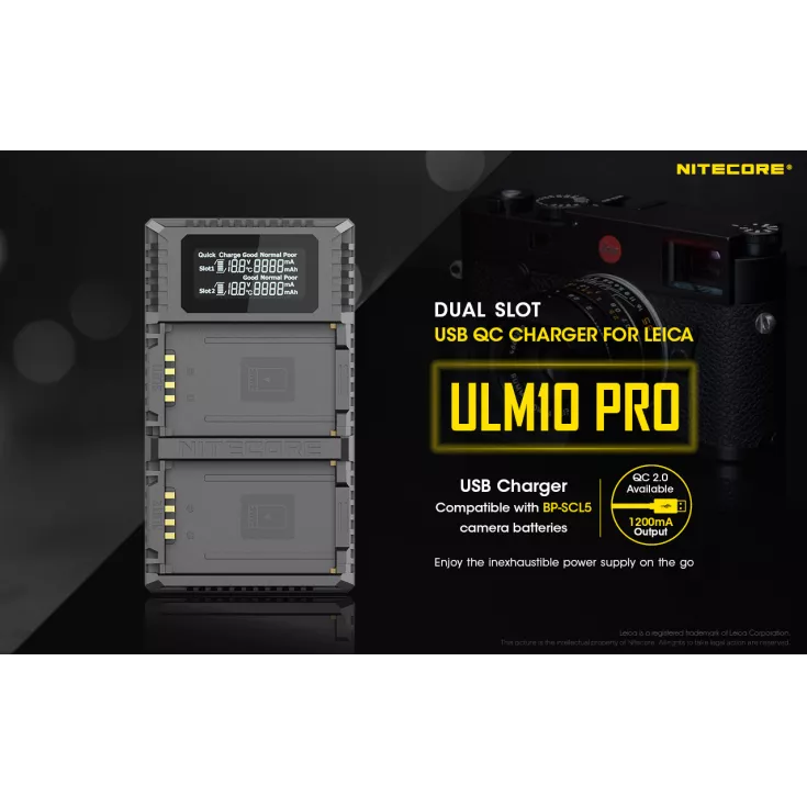 The Nitecore ULM10 Pro charger is compatible with the Leica BP-SCL5 battery, which powers the Leica M10 camera. Ideal for keeping your gear light and portable, the charger uses a USB cable which allows for a variety of power sources, including a USB adapter, power bank or solar panel device.