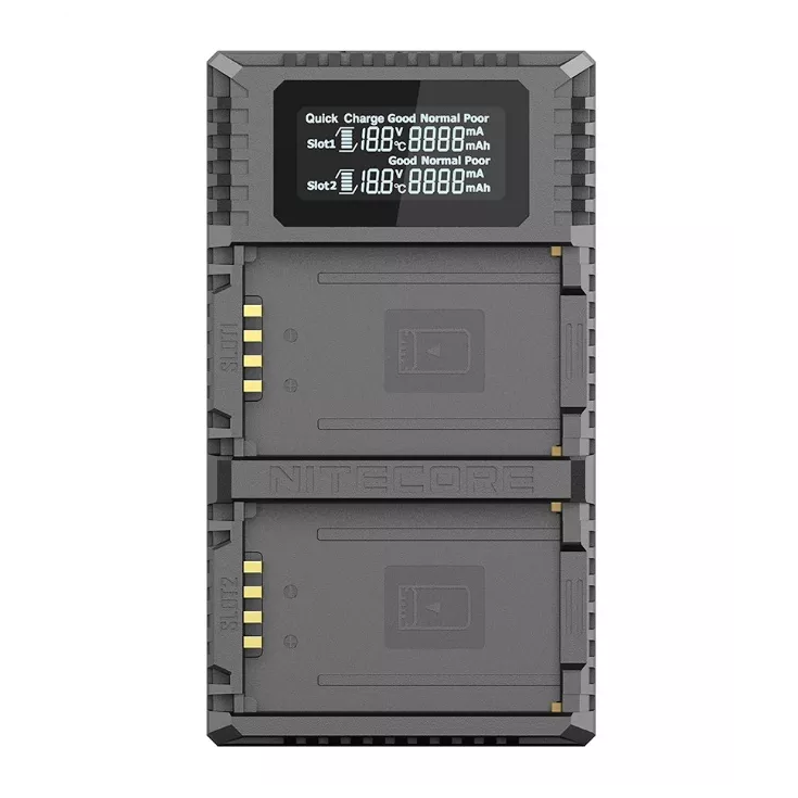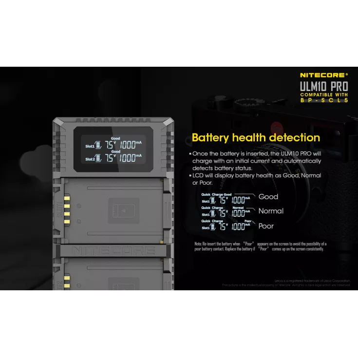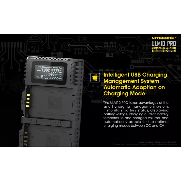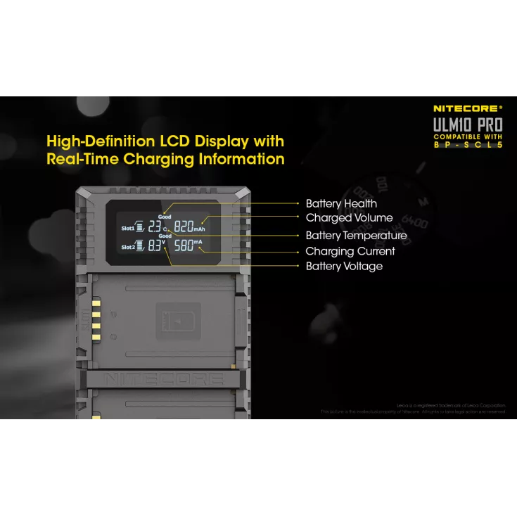 The ULM10 Pro has a dual slot design to allow for up to two BP-SCL5 batteries to be charged simultaneously. The charger has a high definition LCD display screen with real-time charging information on the battery health, charged volume, battery temperature, charging current and battery voltage. The ULM10 Pro features reverse polarity and anti-short circuit protection to keep your batteries in the best health.