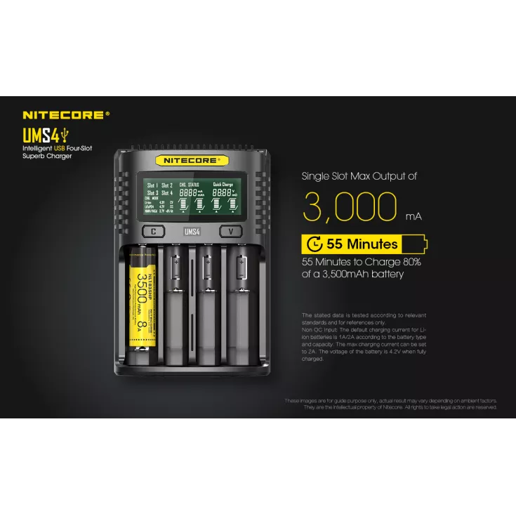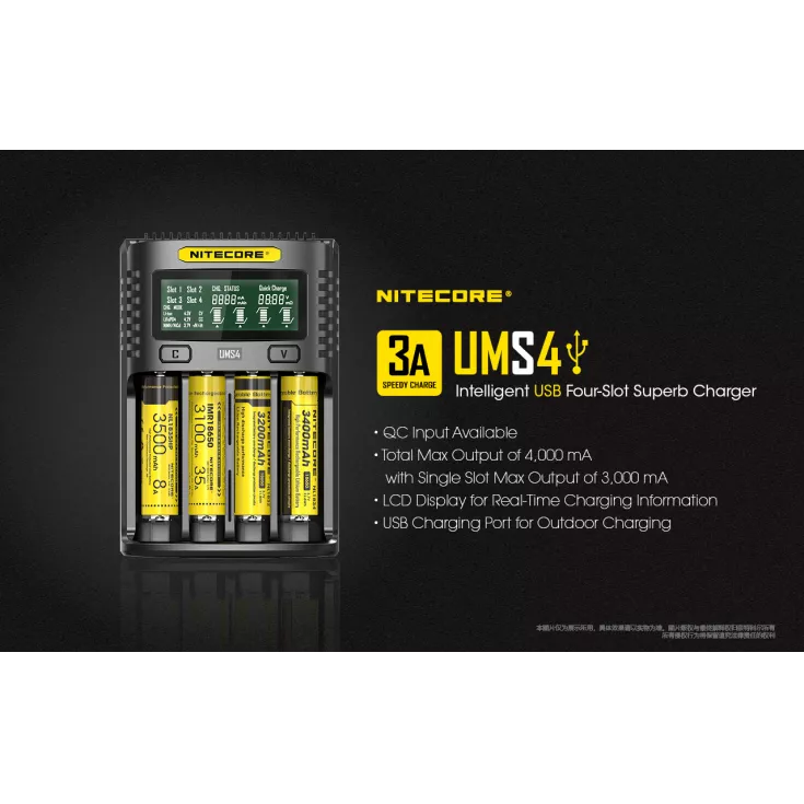 The Nitecore UMS4 is an intelligent USB four slot charger, with QC input available for speedy charging. The total maximum output is 4000mA or 3000mA when using a single slot. Please note, in order to achieve the maximum charging speed a 9V 2A QC 2.0 charging adapter must be used. When using a QC adapter, the UMS4 can charge a 3500mAh 18650 to 80% in just 55 minutes!
