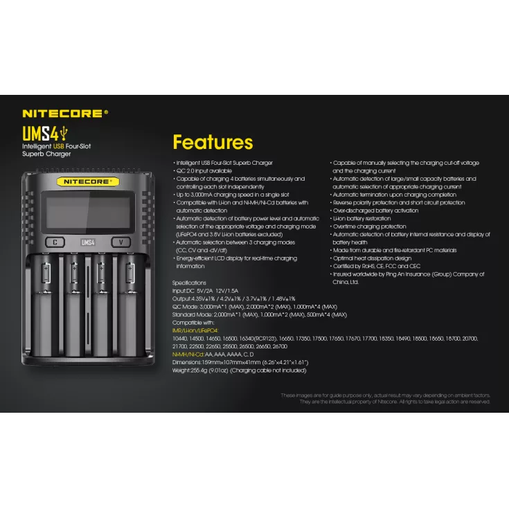 With safety and convenience at the forefront of this design, the Nitecore UMS4 features anti-short circuiting, reverse polarity protection and an energy saving function when there has been no action in 3 minutes.