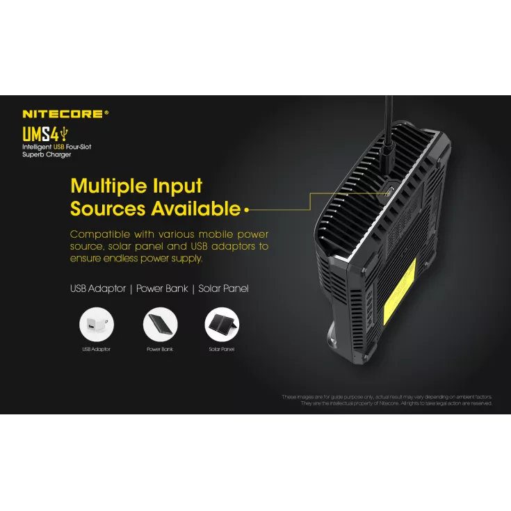 The Nitecore charger is compatible with a range of power sources to ensure it is easy to charge your batteries when you are on the go. The UMS4 can be used with various mobile devices, such as a power bank, solar panel and USB adapter.