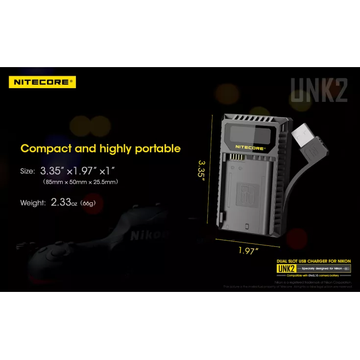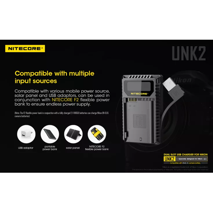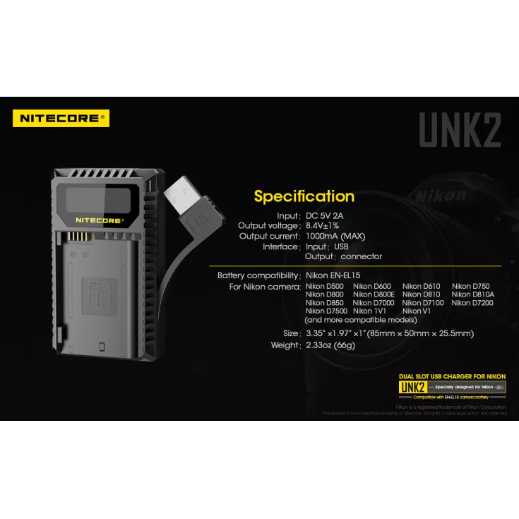 The Nitecore UNK2 battery charger is compatible with the Nikon EN-EL15 camera battery, which is used in a range of Nikon cameras, including the D500, D7500 and Nikon 1V1. The charger is compatible with various power sources, including solar panels, power banks and USB adapters.