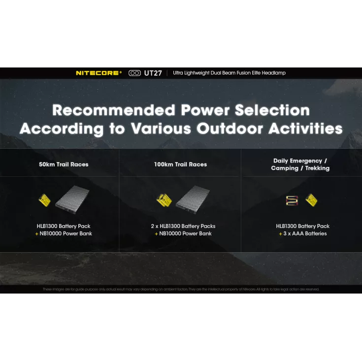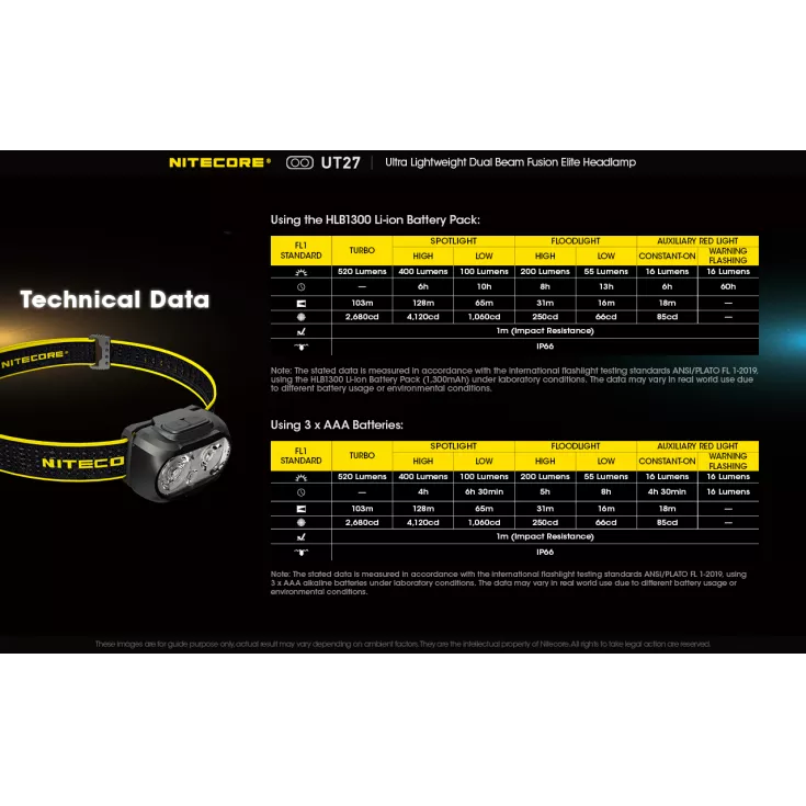 Nitecore UT27 Includes: HLB1300 rechargeable Li-ion battery pack (two included with pro version), USB-C Charging Cable, Headband and Diffusing Stuff Sack.