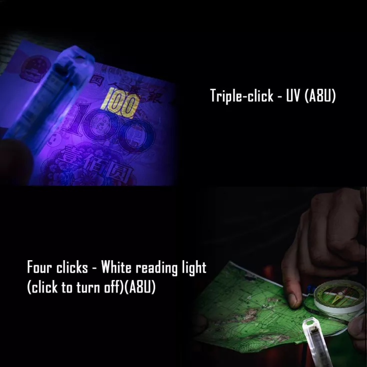 The RovyVon Aurora A8 keyring light is available with 2 options – an amber, red and blue sidelight or a UV, red and white sidelight.
