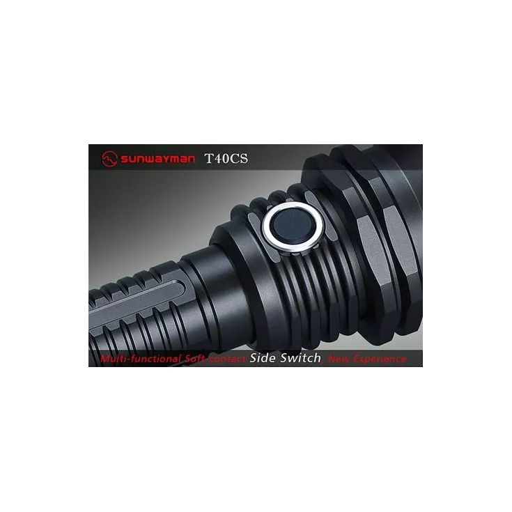 SUNWAYMAN T40CS comes with the newly designed soft-contact side switch, simply depressing the side switch for super-low standby mode (about 50μA super-low standby current), High-Mid-Low output, Hidden Strobe and SOS; When the tail cap switch is turned on, the light can memorize the most recent mode used, moreover, when the light is at standby mode, simply depress and hold the side switch for about 2seconds to activate the max output mode immediately, unaffected by the memory function, we call it “Smart Magic Switch”.